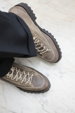 Bottine moderne, à la sophistication douce, qui dégage à la fois quelque chose de luxueux et de primitif.