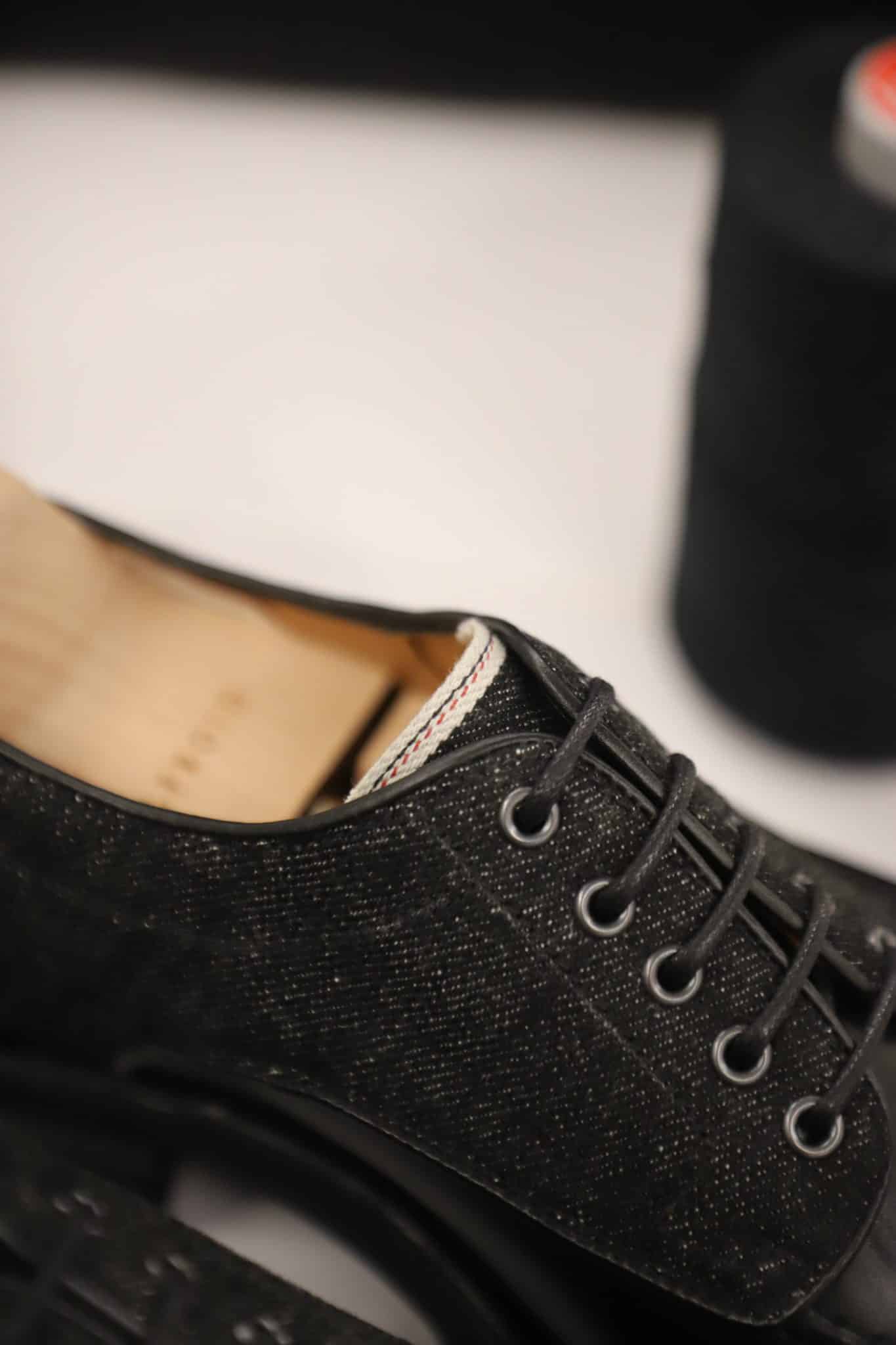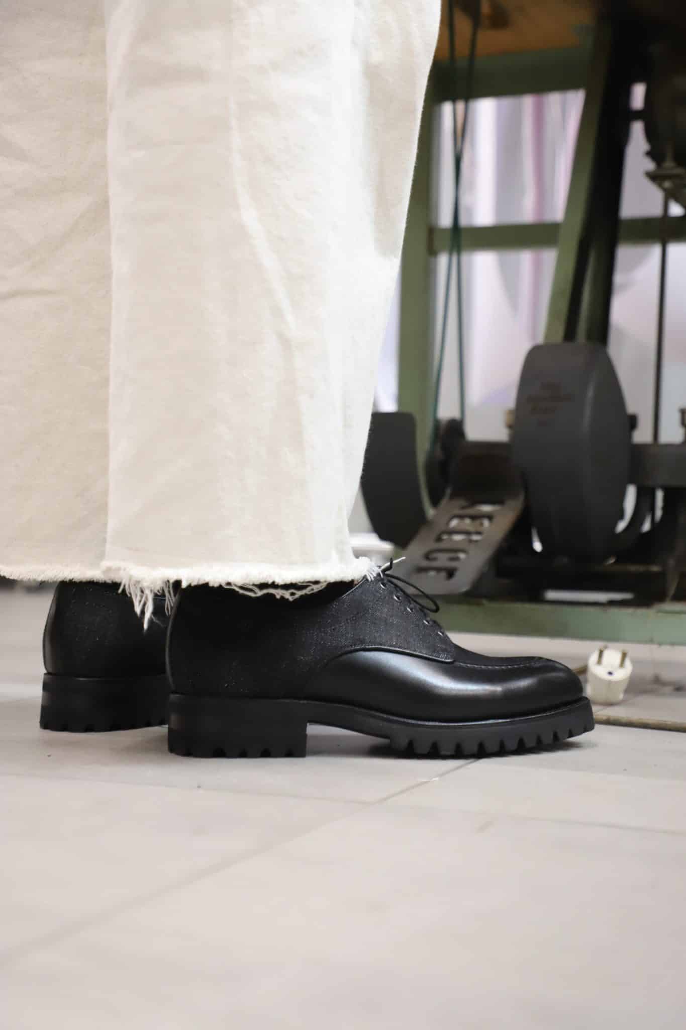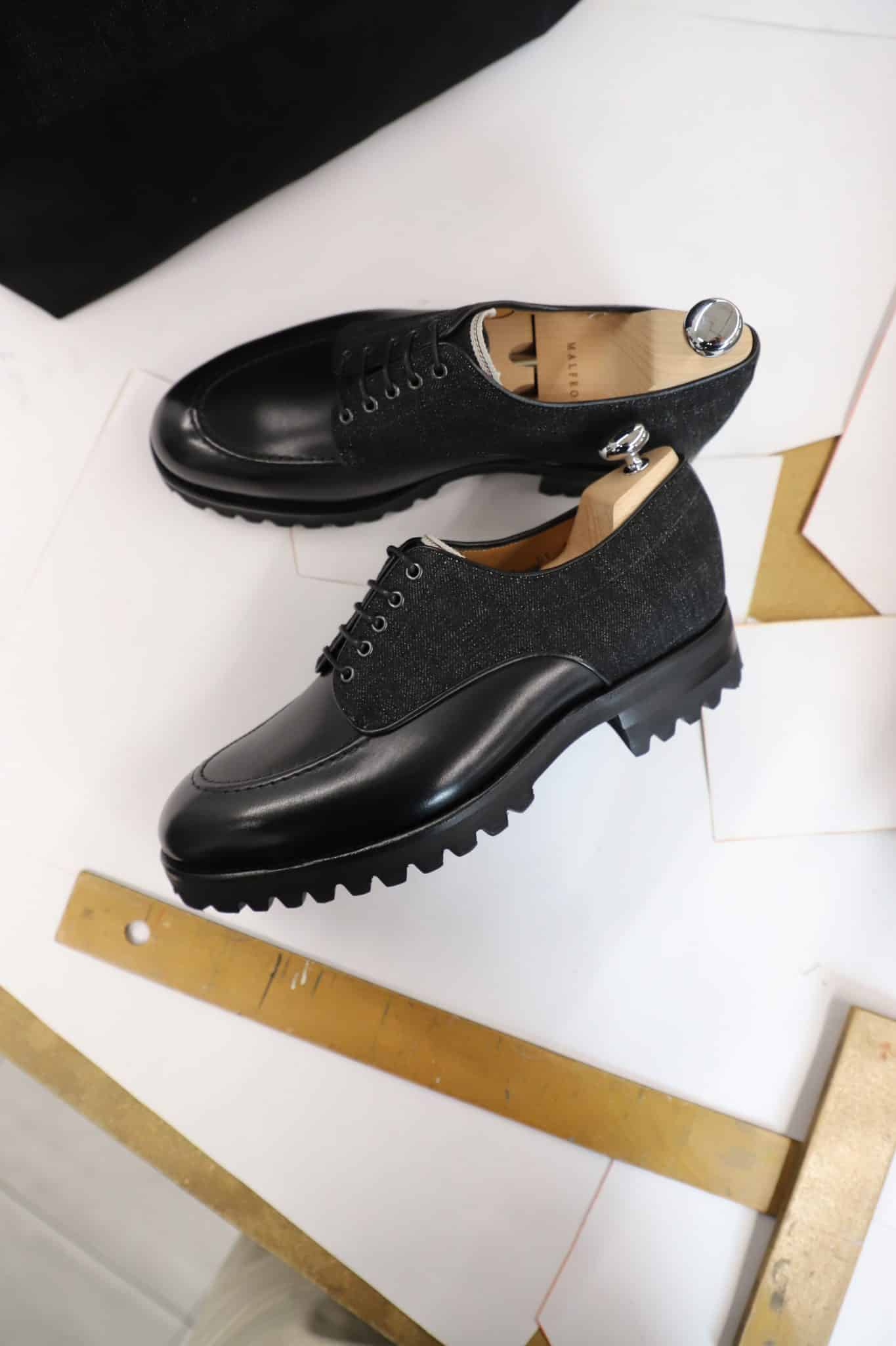 • Contraste de Matières : L’empeigne en cuir lisse rencontre des quartiers en toile denim selvedge, offrant une texture visuelle inédite.